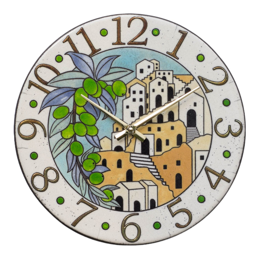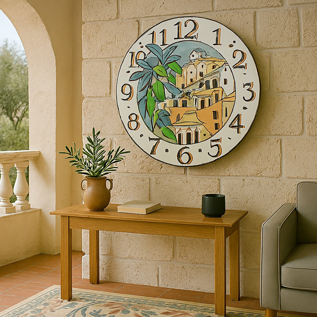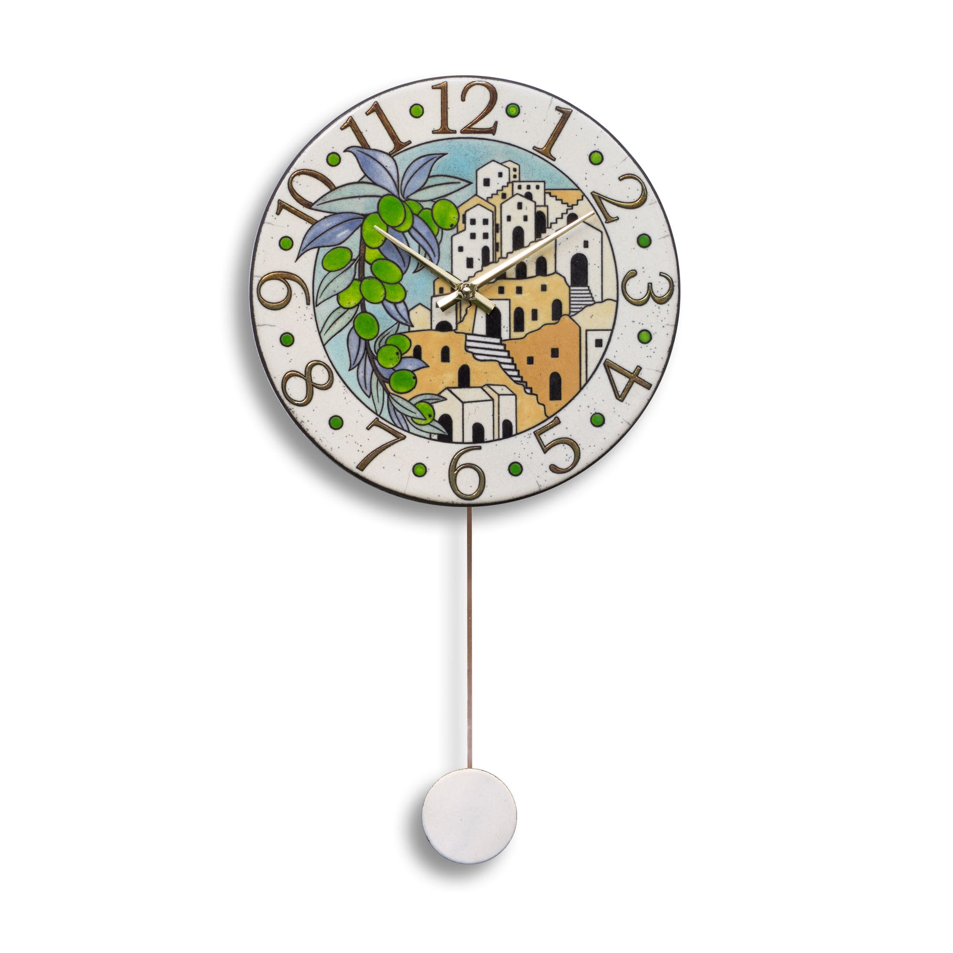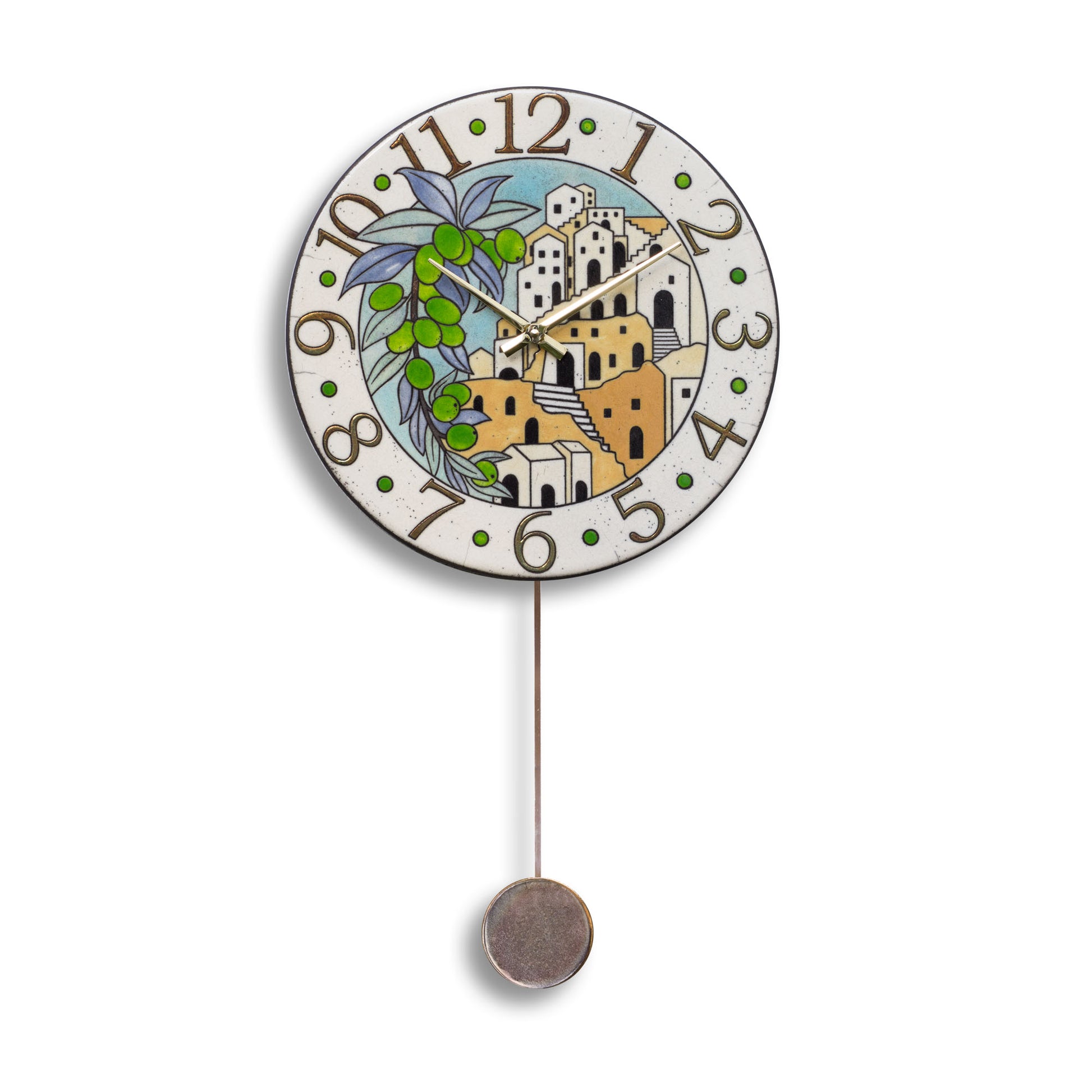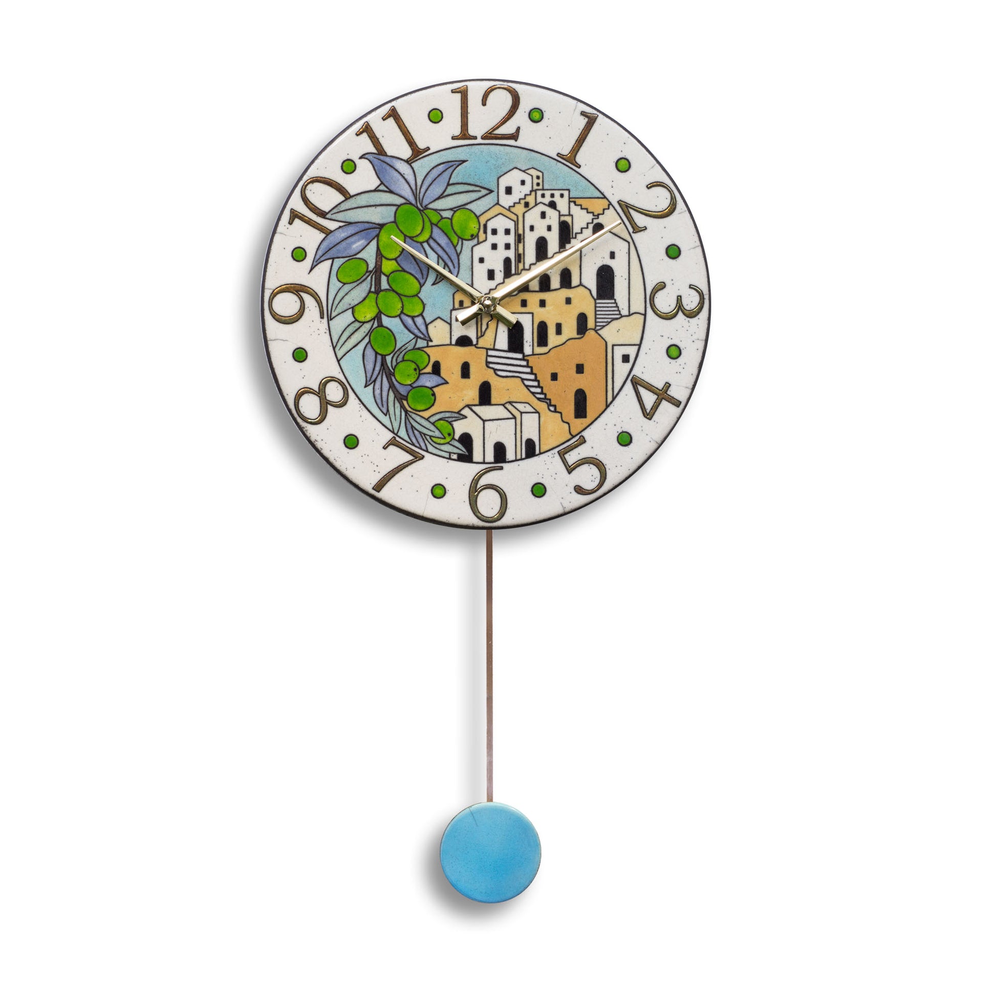 Orologio artigianale da parete modello Mediterraneo in Scala in ceramica fatto a mano in ITALIA, disponibile sia con il pendolo che senza (diametro 35 cm).